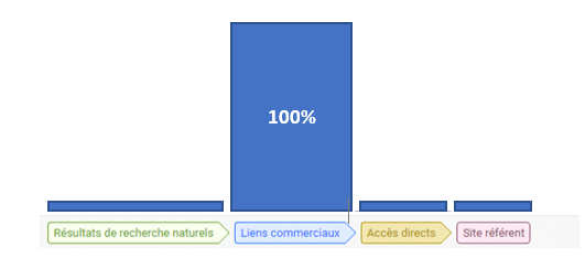 - Le modèle d’attribution "Dernier clic sur une annonce Adwords". Ici seul le clic via le canal « liens commerciaux » reçoit 100% du crédit de la conversion