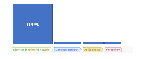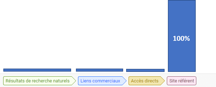 - Le modèle d’attribution "Dernier clic non direct". Tous les accès directs sont ignorés. Ce qui prend du sens si l’on considère que l’internaute qui arrive sur votre site via les accès directs le connaît déjà grâce à d’autres sources de trafic. Dans notre exemple, cela ne change pas l’attribution de la conversion puisque le dernier clic n’est pas direct. 100% de la conversion est donc attribuée aux Sites Référents.