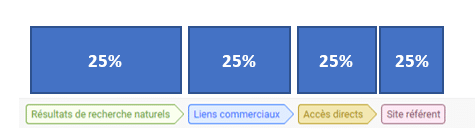 - Le modèle "Attribution linéaire" attribue le même mérite à chacun des leviers ayant contribué à la conversion. Dans notre exemple, chacun des 4 points de contact se voit attribuer 25% de la conversion