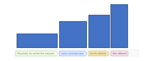 Prenons ici l’exemple d’un internaute qui serait venu sur votre site une 1ère fois via le référencement naturel. Il serait revenu 2 jours plus tard sur le site via vos campagnes de liens sponsorisés, puis un jour plus tard via les accès directs. Enfin, il aurait converti 4 jours après via les sites référents.
