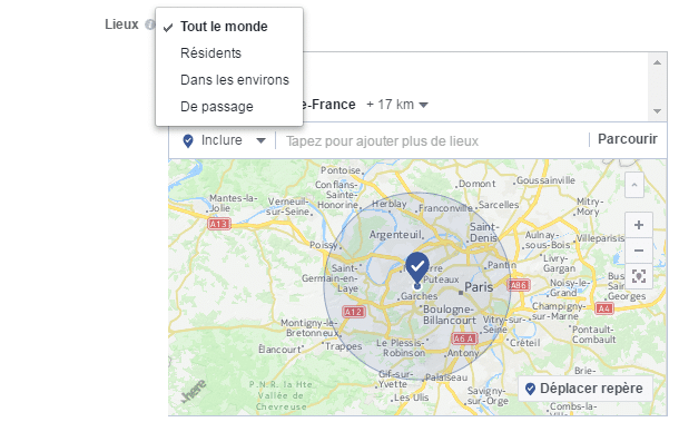 Il est important de savoir que le rayon de ciblage minimum est de 17 km autour d’un point. Cela peut être problématique pour des zones à forte densité démographique. C'est un élément à prendre en compte dans le cadre de campagne de proximité (notoriété d’un point de vente, d’un événement…) par exemple.
