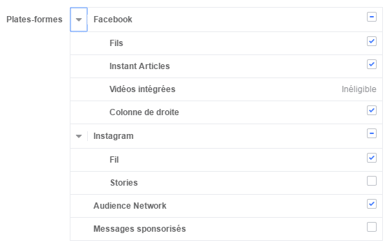 Les possibilités de diffusion varient en fonction de l’objectif marketing, de la typologie d’appareils ciblés et de l’association ou non d’une page à votre campagne. A titre d’exemple, le fils d’actualité n’est accessible qu’aux comptes reliés à une page Facebook. La colonne de droite elle n’est disponible que sur ordinateur.