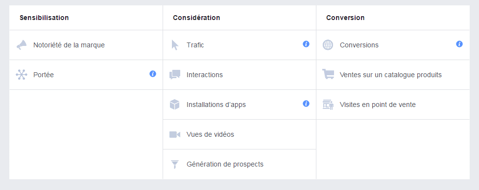 Une campagne publicitaire performante passe obligatoirement par une phase de réflexion pré-paramétrage. Vous devez en ressortir un objectif premier et un ou deux objectifs secondaires. Facebook propose différents dispositifs, vous trouverez parmi eux le plus adaptés à votre besoin. Chacun de ces dispositifs possède ses caractéristiques propres en termes de format d’annonces, d’indicateurs statistiques ou de possibilité de ciblage.