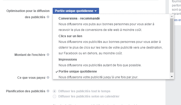 Afin d’obtenir de meilleures performances, il est possible de mixer les optimisations pour la diffusion avec l’indicateur qui déclenche vos frais d’achats. Vous pouvez en effet payer à l’action (objectif) ou à l’impression (CPM). Ainsi il est possible de créer des synergies entre ces paramètres.